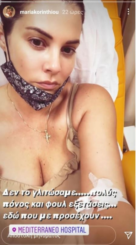 Συγκεκριμένα, η ηθοποιός ανέβασε χθες σε instastory μια φωτογραφία όπου η ίδια φαίνεται να βρίσκεται στο κρεβάτι ιδιωτικού νοσοκομείου της Γλυφάδας με ορό στο χέρι της, σημειώνοντας πάνω στο στιγμιότυπο, «Δεν το γλιτώσαμε… πολύς πόνος και φουλ εξετάσεις… εδώ που με προσέχουν».