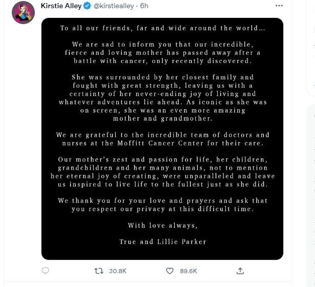 Τα παιδιά της True και Lillie Parker έκαναν γνωστή τη δυσάρεστη είδηση γράφοντας στον επίσημο λογαριασμό της στο Twitter:« Με θλίψη σας ενημερώνουμε ότι η μητέρα μας έφυγε από τη ζωή μετά από μάχη με τον καρκίνο, που ανακαλύφθηκε μόλις πρόσφατα... Όσο εμβληματική ήταν στην οθόνη, ήταν μια ακόμα πιο καταπληκτική μητέρα και γιαγιά», συνεχίζει η ανακοίνωση, στην οποία αναφέρεται στο πάθος, την αγάπη και τη δημιουργικότητα της Kristie Alley και ευχαριστεί τους γιατρούς και τους νοσηλευτές του Ιατρικού Κέντρου Moffitt για τη φροντίδα.
