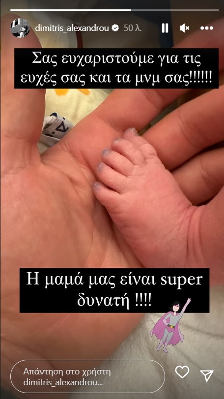 Ωστόσο λίγα λεπτά μετά την ανάρτηση του story της Τούνη, ο Δημήτρης Αλεξάνδρου ανέβασε και αυτός ένα story και μας έδειξε για πρώτη φορά το γιο του γράφοντας στη λεζάντα: «Σας ευχαριστούμε για τις ευχές και τα μηνύματά σας. Η μαμά είναι super δυνατή».